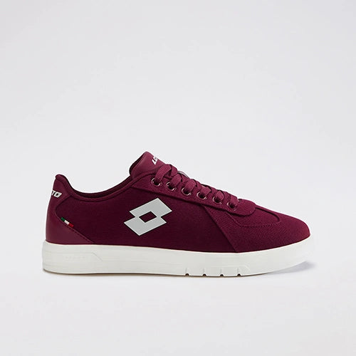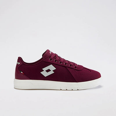 A pair of maroon sneakers with lace up closure
