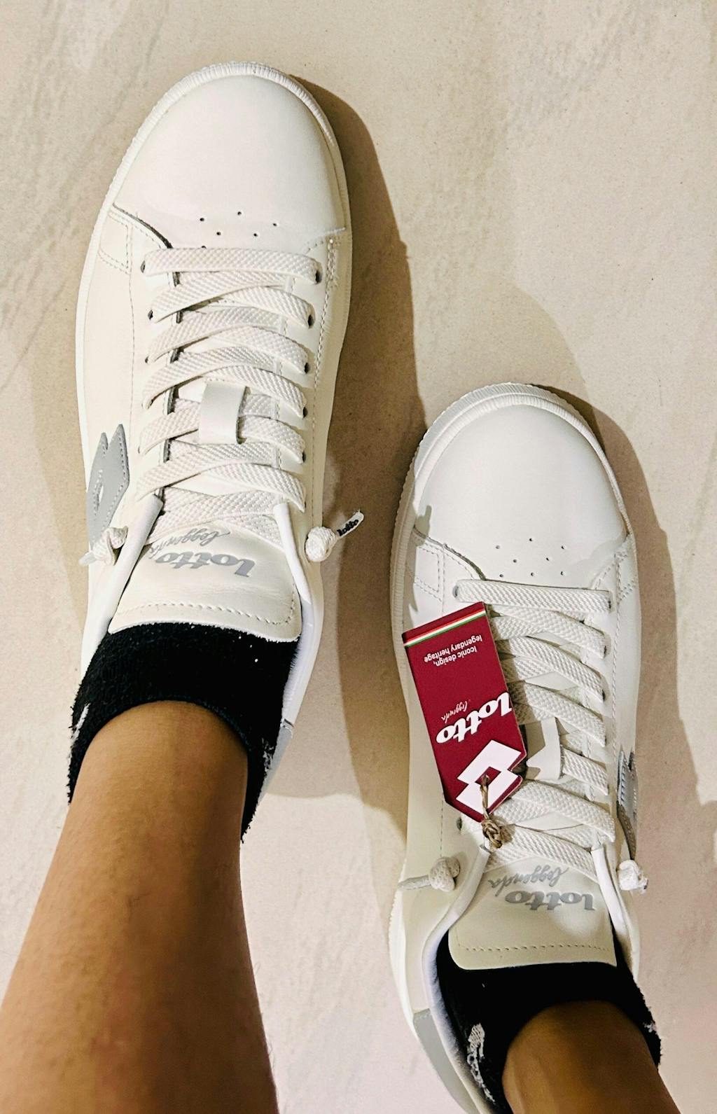 A pair of white premium leather sneakers with lace up closure