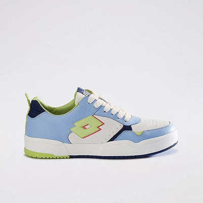 A pair of blue and white premium leather sneakers with lace-up closure